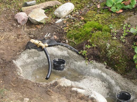 Det visade sig dock inte vara helt lätt att få dammen tät, då berget i sig har sprickor. Det slutade med att vi fick lägga gummiduk i den djupare delen av dammen. Men att fästa gummi mot berg under vatten visade sig vara utmaning nummer 2. Min man kan efter detta projekt utses till limexpert efter alla tappra försök med olika slags limprodukter! Utmaning nummer 3 kvarstår och är en liten kapilläravrinning på höger sida, vilket är något som ska åtgärdas sommaren 2010.